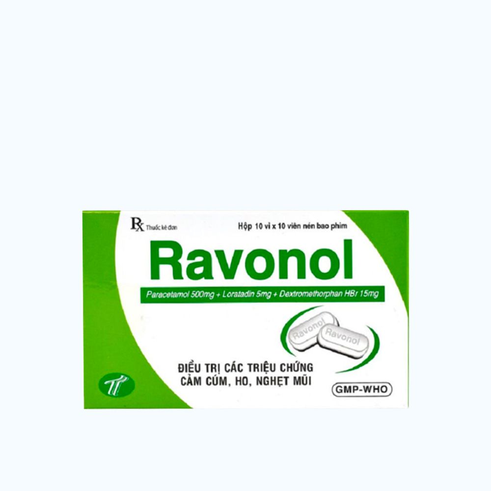 Thuốc cảm cúm Ravonol (viên nén) có tác dụng làm hạ thân nhiệt, hạ sốt và giảm đau. Bên cạnh đó, thuốc cũng ức chế quá trình giải phóng các yếu tố gây viêm, làm giảm các tác động của chúng tới đường hô hấp. Từ đó có hiệu quả trong việc giảm các triệu chứng viêm đường hô hấp như sổ mũi, chảy nước mũi, viêm mũi dị ứng. Ngoài ra thuốc còn có tác dụng giảm ho, giảm tần suất và mức độ của các cơn ho. Các tác dụng của thuốc có được là do hoạt tính sinh học của các thành phần chính có trong thuốc.