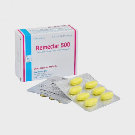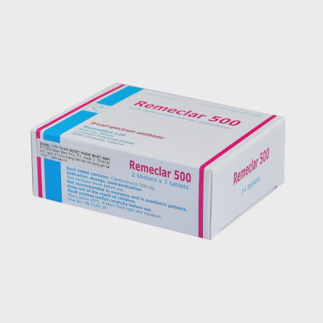 - Liệu trình gồm 2 thuốc (14 ngày): 500 mg clarithromycin x 3 lần/ngày trong 14 ngày. Nên dùng Remeclar với omeprazole uống 40 mg/ngày trong 28 ngày.