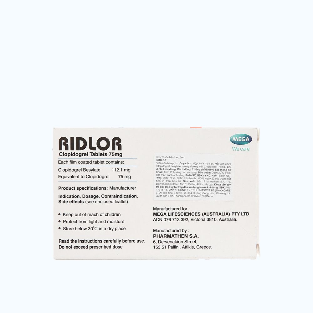 Thuốc Ridlor 75mg được chỉ định nhằm ngăn ngừa tai biến đông máu ở bệnh nhân nhồi máu cơ tim (từ sau 1 vài ngày đến trước 35 ngày), đột quỵ thoáng qua (từ 7 ngày đến trước 6 tháng) hay bệnh động mạch ngoại biên đã được thành lập.