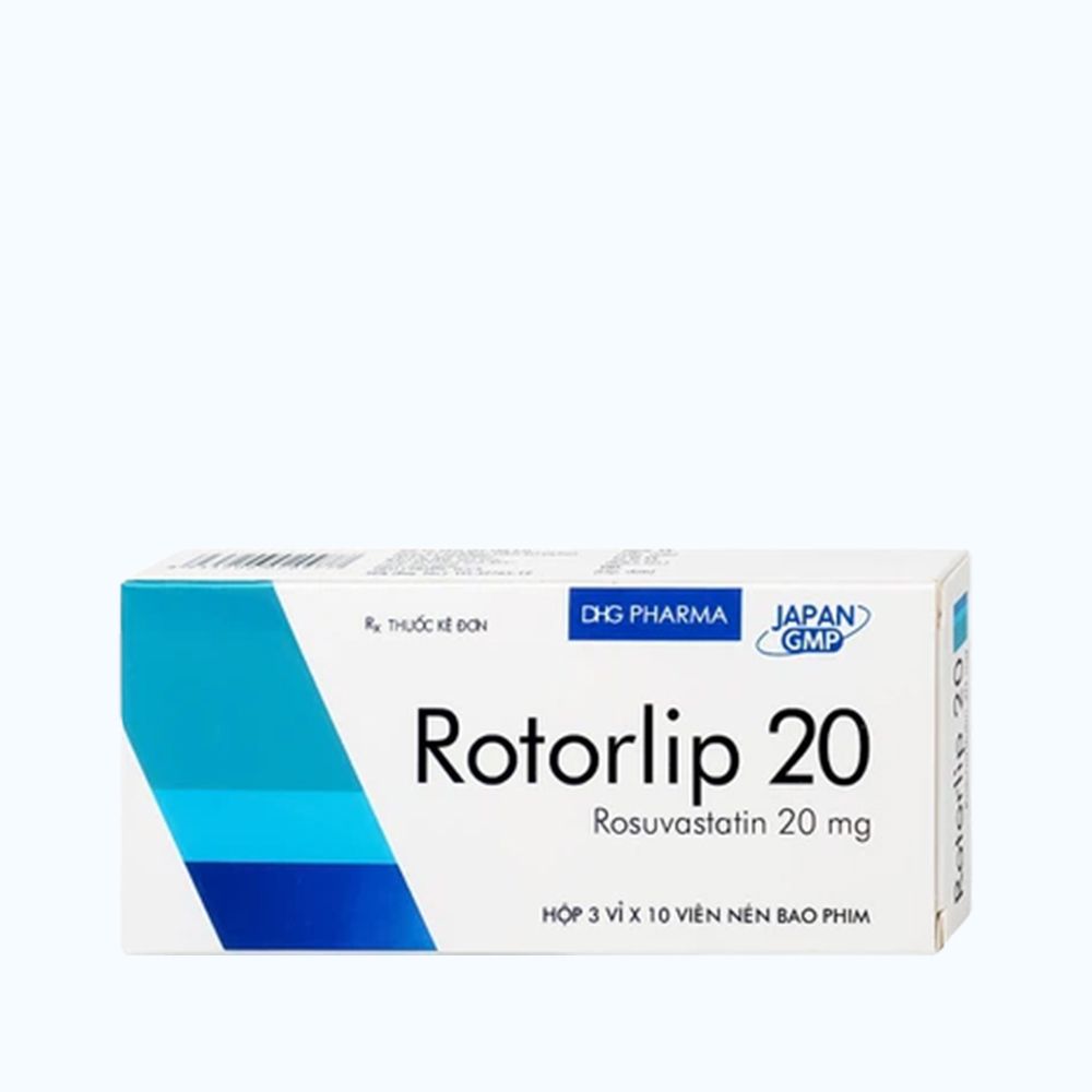 Rotorlip 20 DHG là thuốc chứa hoạt chất rosuvastatin, thuộc nhóm statin, được sử dụng để điều trị tăng cholesterol máu và dự phòng các biến cố tim mạch. Thuốc có tác dụng làm giảm cholesterol xấu (LDL-C) và triglycerid, đồng thời tăng cholesterol tốt (HDL-C). Rotorlip 20 DHG được chỉ định trong các trường hợp tăng cholesterol máu nguyên phát, rối loạn lipid máu hỗn hợp, và để làm chậm sự tiến triển của xơ vữa động mạch vành.