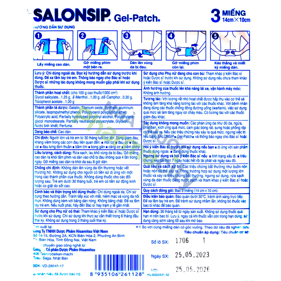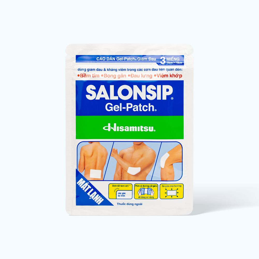 Cao dán Salonsip Gel – Patch chỉ định dùng cho người lớn và trẻ em từ 30 tháng tuổi trở lên dùng giảm đau, kháng viêm trong các cơn đau liên quan đến: Mỏi cơ, đau cơ, đau vai, đau lưng đơn thuần, bầm tím, bong gân, căng cơ, viêm khớp.