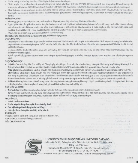 - Hoạt chất:Clopidogrel (dưới dạng Clopidogrel bisulfat) 75mg.