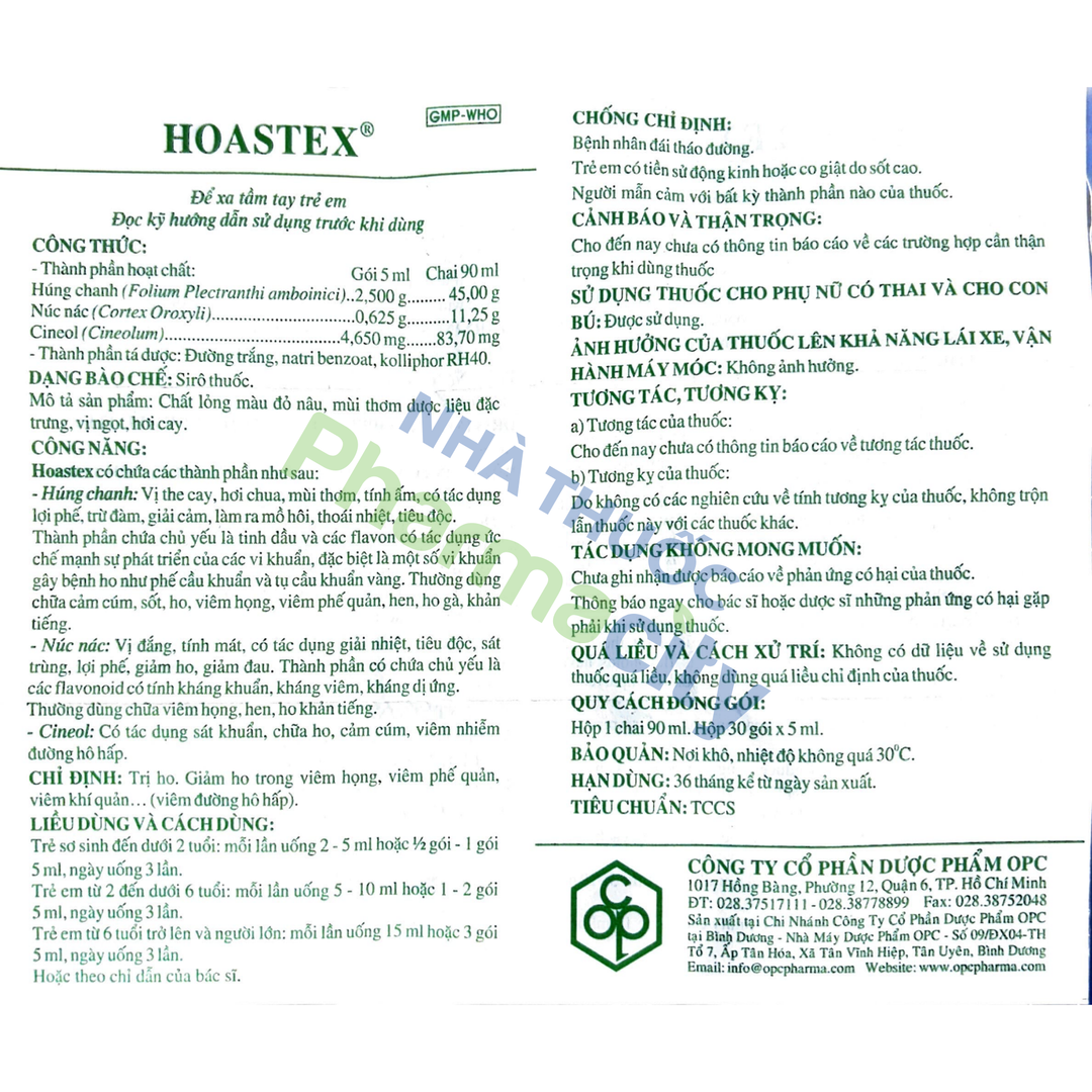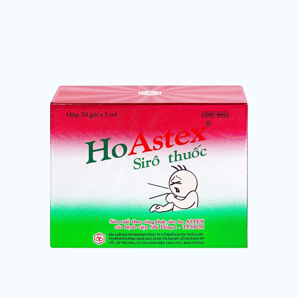 HoAstex là sản phẩm của Công ty cổ phần dược phẩm OPC, có tác dụng điều trị ho, giảm ho trong viêm họng, viêm phế quản, viêm khí quản… (viêm đường hô hấp). Thuốc được bào chế dạng siro có các thành phần như: Húng chanh (Folium Plectranthi amboinici), núc nác (Cortex Oroxyli), cineol (Cineolum). Hoastex bào chế dưới dạng siro thuốc, hộp 30 gói 5 ml.