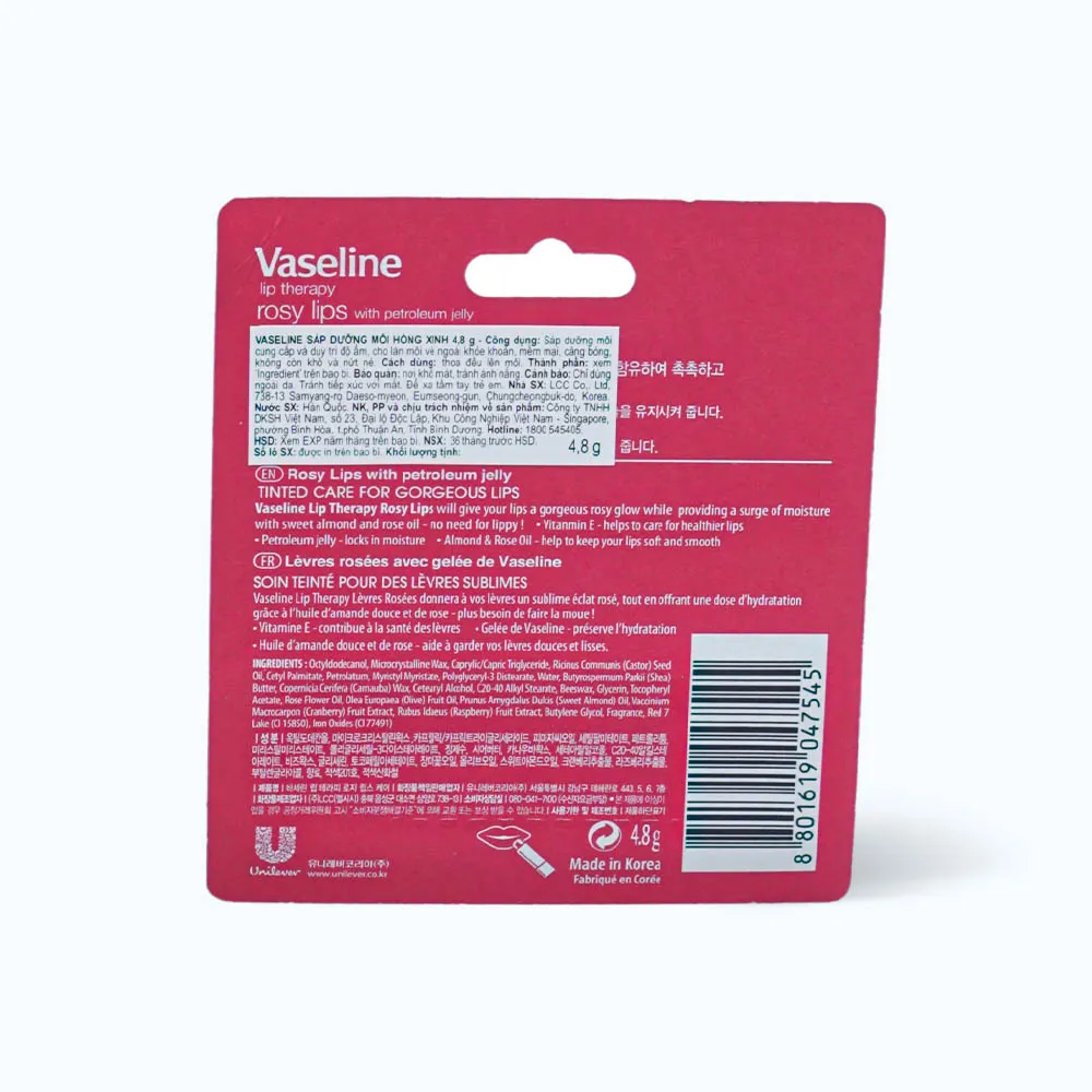 Son Dưỡng Vaseline Rosy Lips Hồng Xinh 4.8g với thành phần chứa bơ hạt mỡ sẽ lập tức làm mềm và mượt, giúp không chỉ là che phủ bề mặt môi mà còn chữa lành bảo vệ làn da môi, và giảm thiểu sự khó chịu. Cho bạn một đôi môi mọng và khỏe đẹp ánh lên sắc hồng tươi tắn.