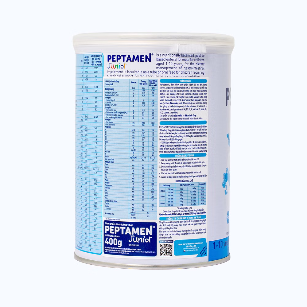 Peptamen® Junior là công thức đầy đủ và cân đối với đạm Whey được thủy phân thành peptides dành cho trẻ từ 1 – 10 tuổi. Thích hợp cho trẻ có hệ tiêu hóa yếu, trẻ cần được hỗ trợ dinh dưỡng thông qua đường uống hoặc nuôi ăn qua ống thông. Có thể thay thế hoàn toàn bữa ăn hoặc bổ sung cho chế độ ăn hàng ngày.