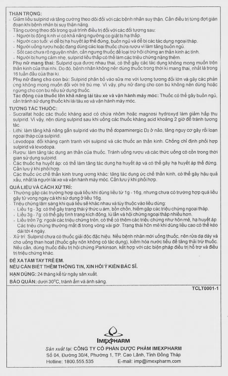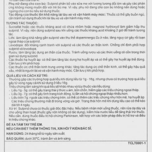 – Sucralfat hoặc các thuốc kháng acid có chứa nhôm hoặc magnesi hydroxyd làm giảm hấp thu sulpirid. Vì vậy, nên dùng sulpirid sau khi uống các thuốc kháng acid khoảng 2 giờ để tránh tương tác.
