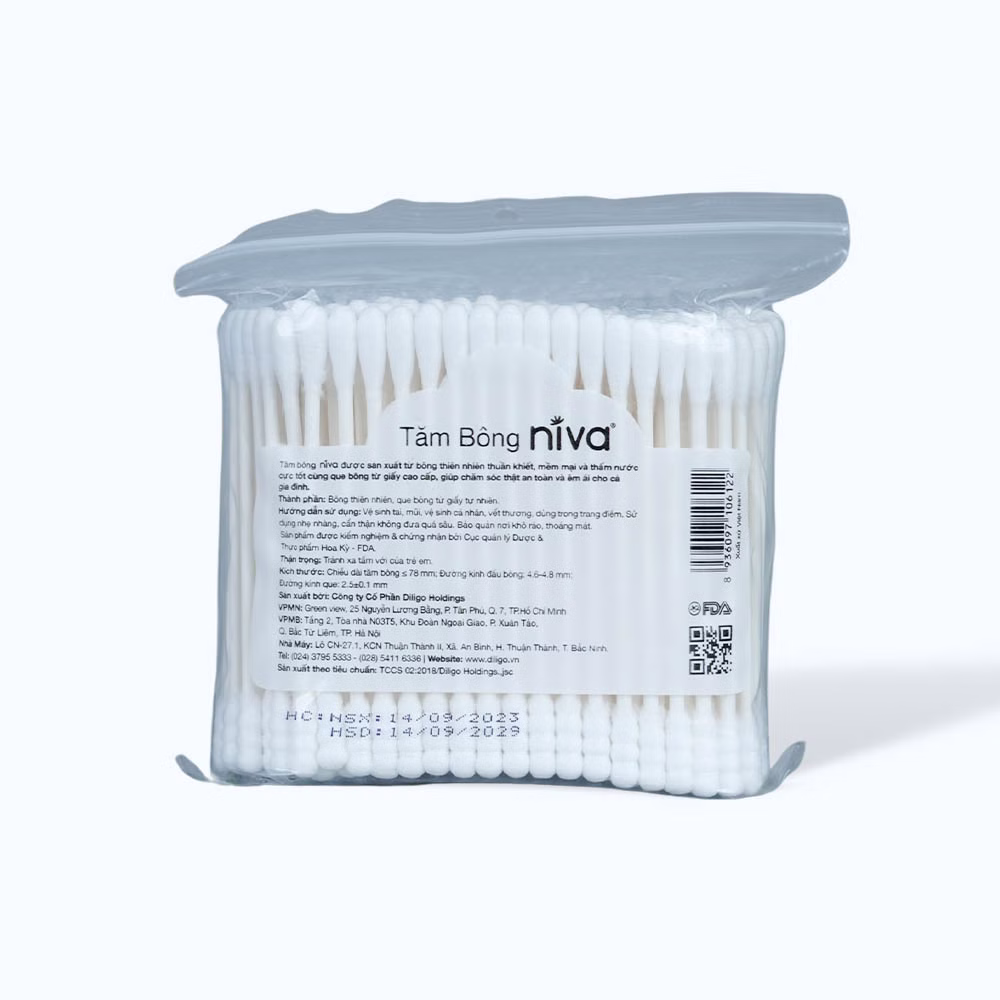 - Sản phẩm đạt chứng nhận chất lượng FDA: Ngoài các ưu điểm trên, Tăm bông Niva còn được đánh giá cao về chất lượng với sợi bông 100% từ bông tự nhiên với độ tinh khiết cao, không pha lẫn tạp chất, không sử dụng hóa chất tẩy trắng. Sản phẩm ứng dụng công nghệ sản xuất hiện đại được chứng nhận chất lượng bởi Cục quản lý Thực phẩm và Dược phẩm Hoa Kỳ (FDA) và được Viện Pasteur TP HCM kiểm nghiệm, cam kết mang đến sản phẩm an toàn và chất lượng cho người sử dụng.