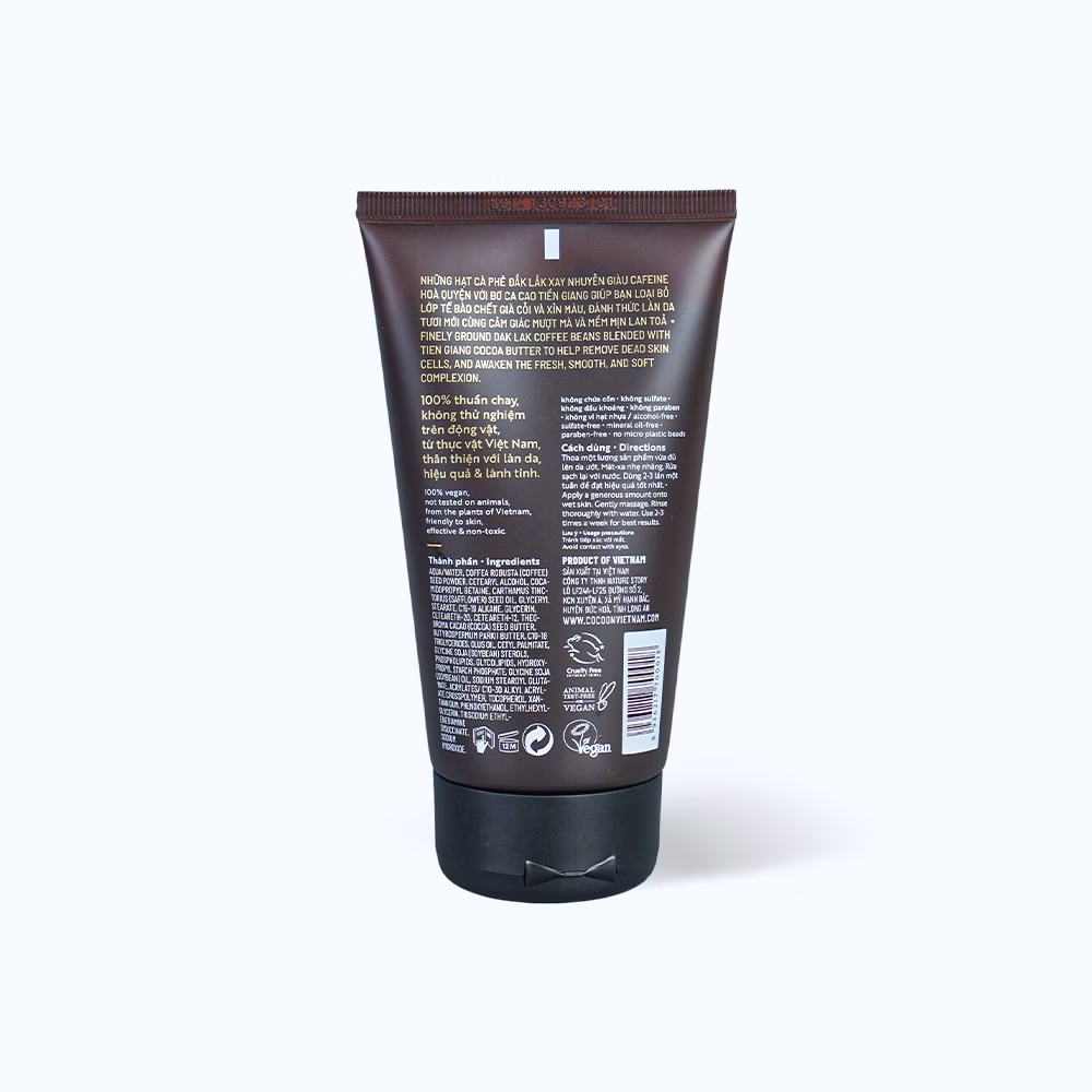 Những hạt cà phê Đắk Lắk xay nhuyễn giàu cafeine hòa quyện với bơ cacao Tiền Giang giúp bạn loại bỏ lớp tế bào chết già cỗi và xỉn màu, đánh thức làn da tươi mới đầy năng lượng cùng cảm giác mượt mà và mềm mịn lan tỏa.