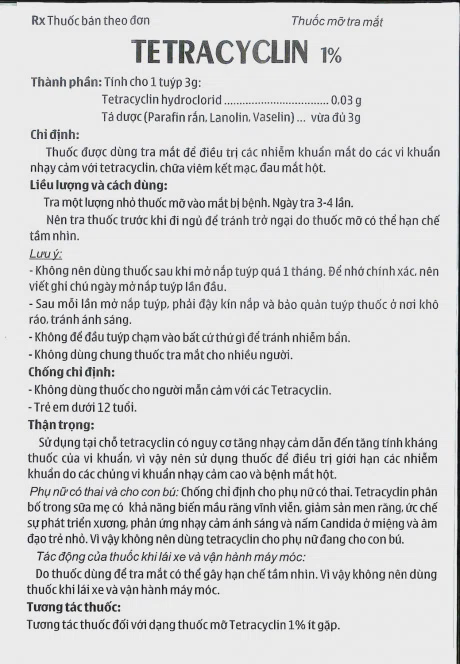 Tetracydin dạng thuốc mỡ 1%, khi dùng trực tiếp lên mắt thuốc cho tác dụng tại chỗ, mức độ hấp thu phụ thuộc mức độ tổn thương kết mạc mắt.