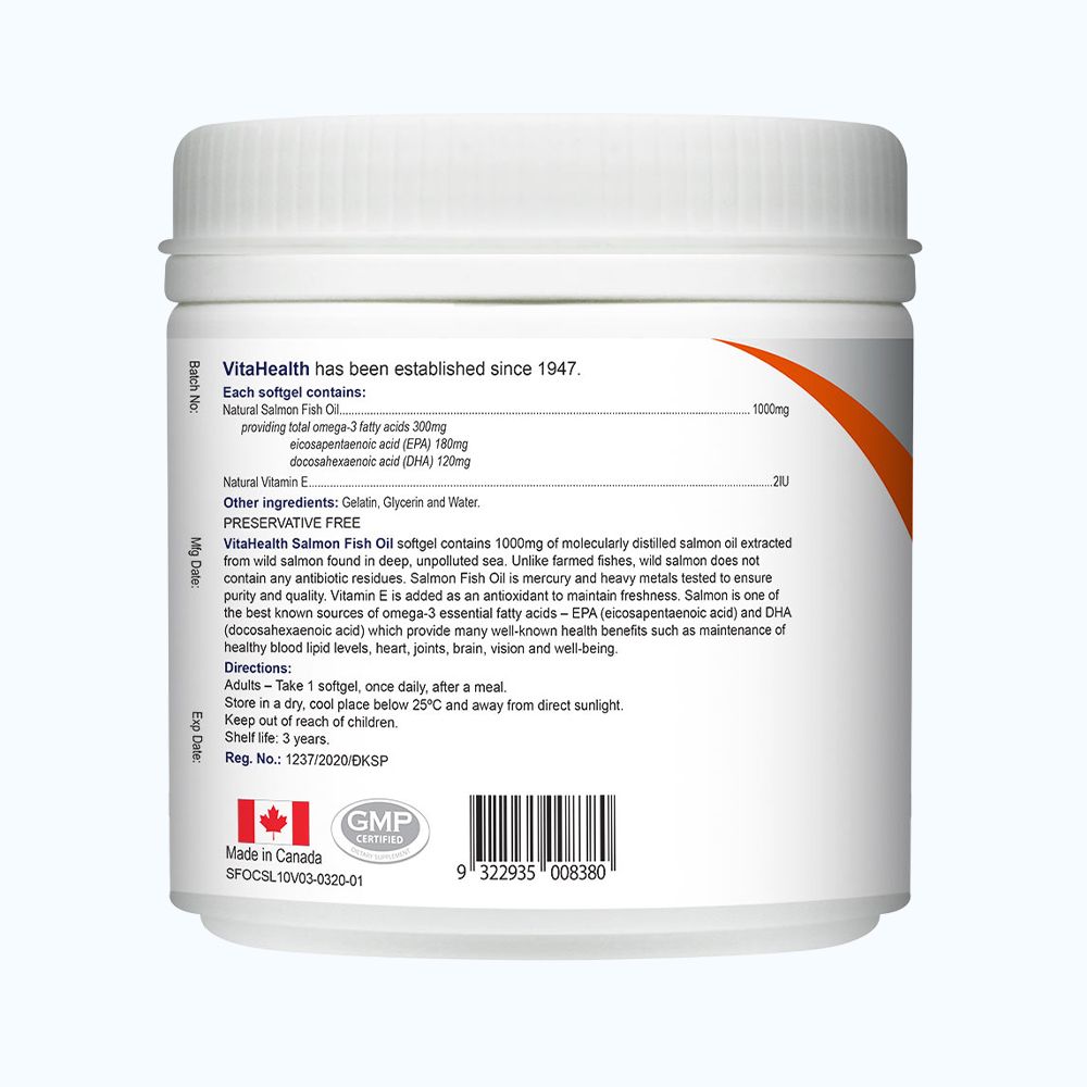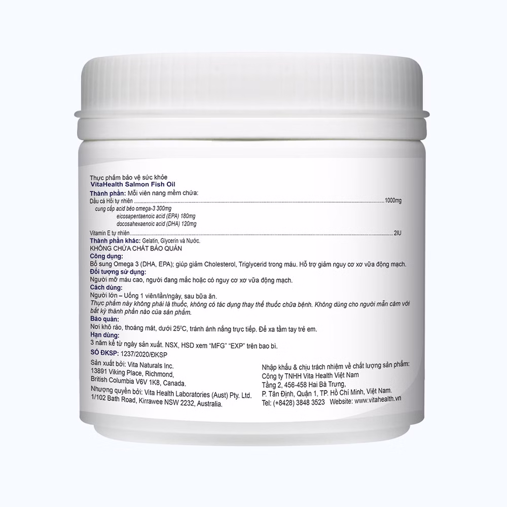 Dầu cá Hồi tự nhiên 1000mg cung cấp acid béo omega-3 300mg, eicosapentaenoic acid (EPA) 180mg, docosahexaenoic acid (DHA) 120mg