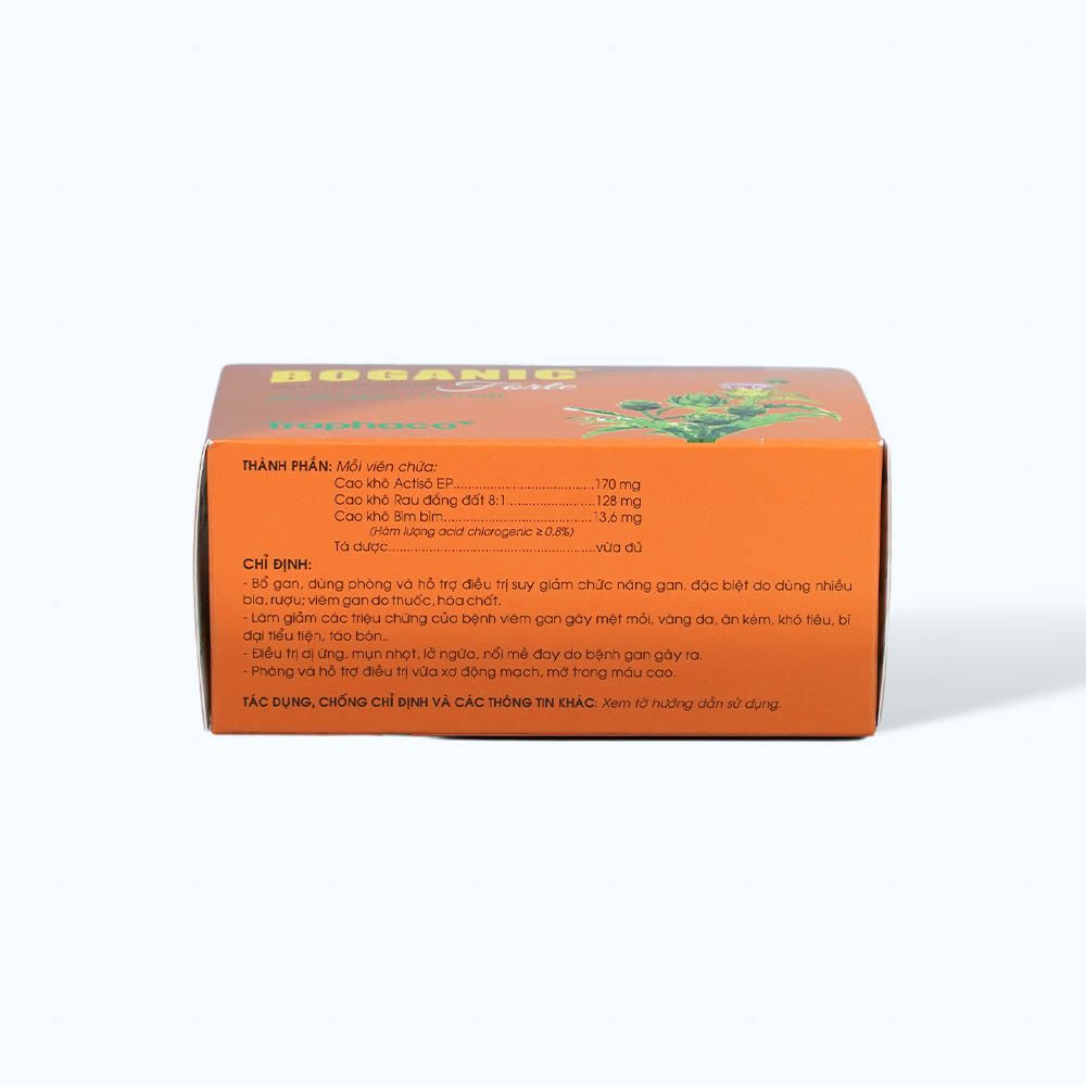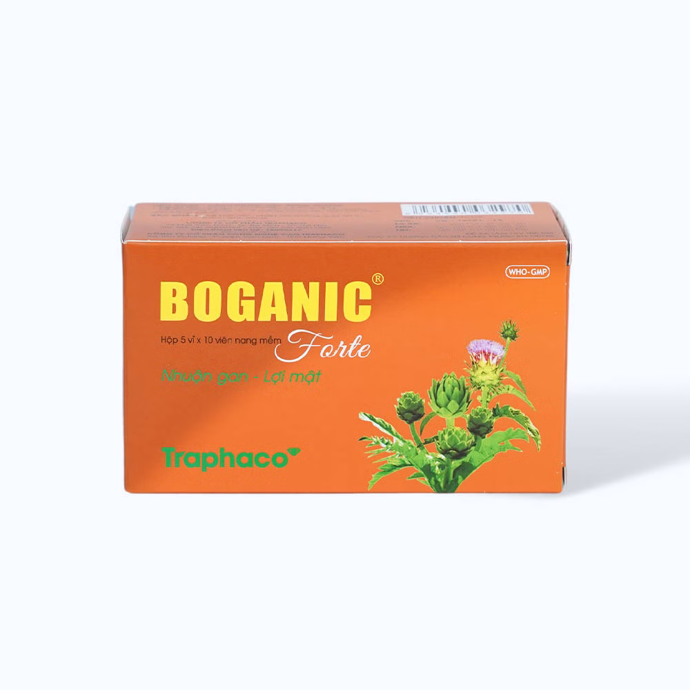 Thuốc Boganic Forte của Công ty Cổ phần Công Nghệ Cao Traphaco, với hoạt chất chính là Cao Actisô, Cao Rau đắng đất, Cao Bìm bìm. Đây là thuốc được dùng điều trị trong suy giảm chức năng gan, đặc biệt do dùng nhiều bia, rượu, phòng và hỗ trợ điều trị viêm gan do thuốc, hóa chất, viêm gan gây mệt mỏi, khó tiêu, vàng da, bí đại tiểu tiện, táo bón. Ngoài ra, thuốc còn được dùng trong trường hợp dị ứng, mụn nhọt, lở ngứa, nổi mề đay do gan gây ra và vữa xơ động mạch, mỡ trong máu cao.