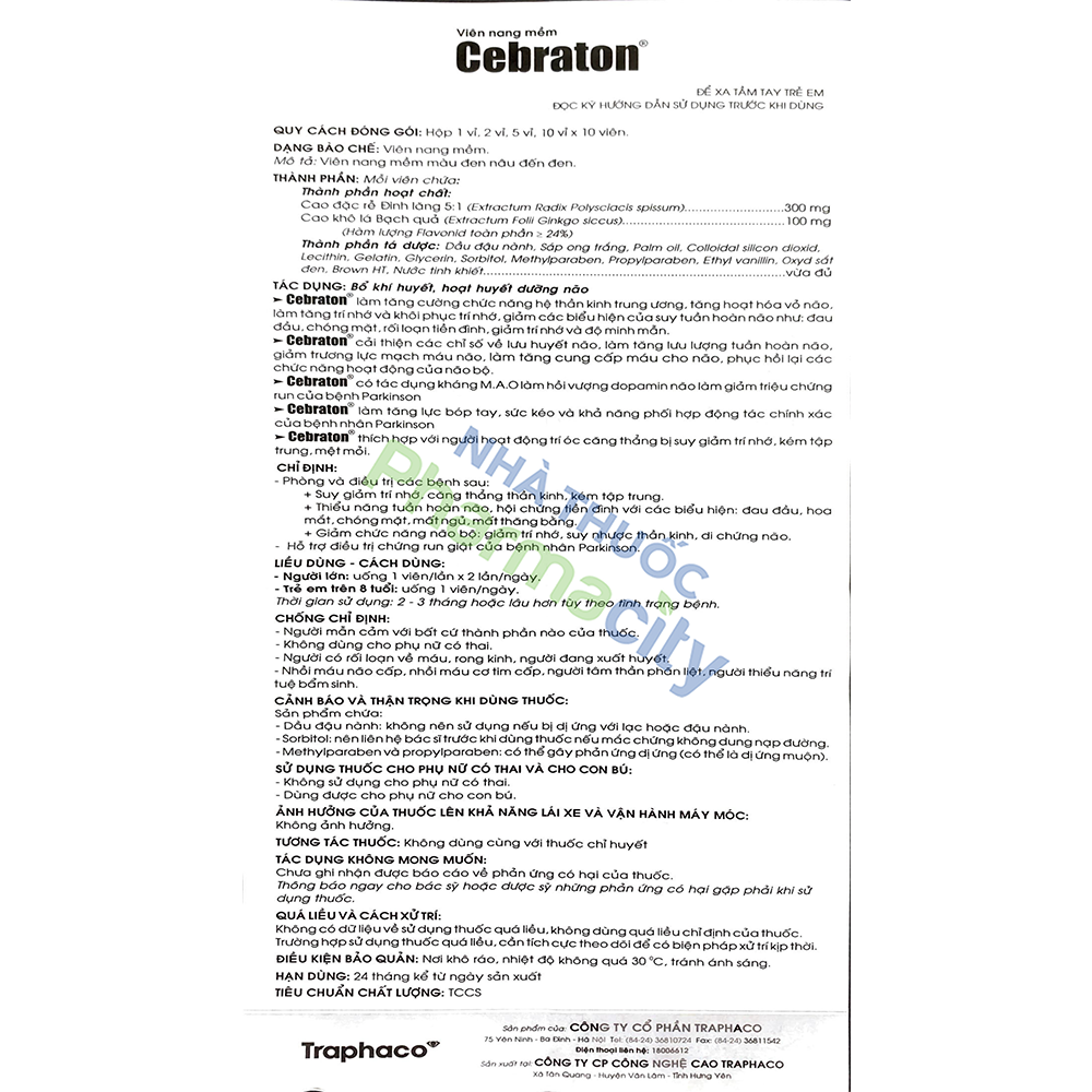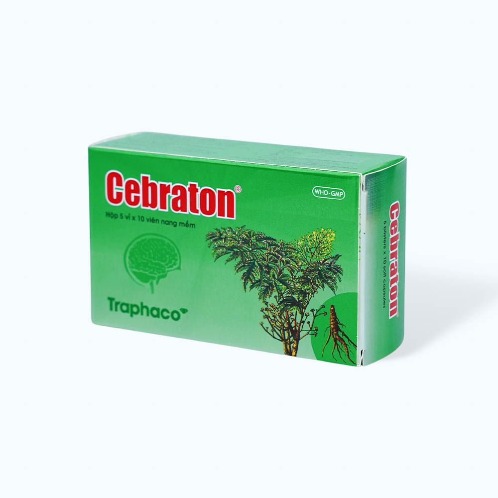 Viên nang Cebraton là thuốc bổ thần kinh được bào chế từ 100% dược liệu nguồn gốc thảo mộc với sự tiếp thu kết quả nghiên cứu đầy đủ của các thầy thuốc Pháp và Việt Nam. Cebraton là sản phẩm của Công ty Cổ phần Traphaco bào chế từ dược liệu cao đặc rễ đinh lăng và cao khô lá bạch quả có tác dụng phòng và điều trị suy giảm trí nhớ, căng thẳng thần kinh, kém tập trung; hội chứng tiền đình hay suy nhược thần kinh. Sản phẩm này còn hiệu quả trong điều trị chứng run giật của bệnh nhân Parkinson.