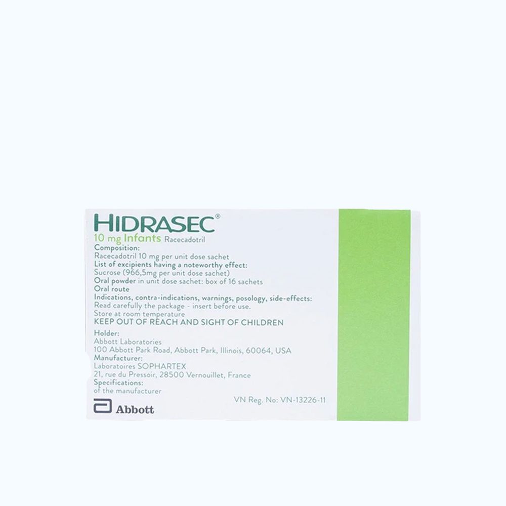 Không nên sử dụng racecadotril trong trường hợp tiêu chảy có liên quan đến dùng kháng sinh và tiêu chảy mạn tính do không có đủ dữ liệu. Nếu trẻ bị tiểu đường, cần chú ý mỗi gói Hidrasec 10 mg Infants chứa 0,966 g sucrose. Nếu lượng sucrose (nguồn glucose và fructose) có trong liệu hàng ngày của Hidrasec 10 mg Infants vượt quá 5 g mỗi ngày, thì sau đó phải tính toán tỷ lệ đường dùng hàng ngày cho trẻ.