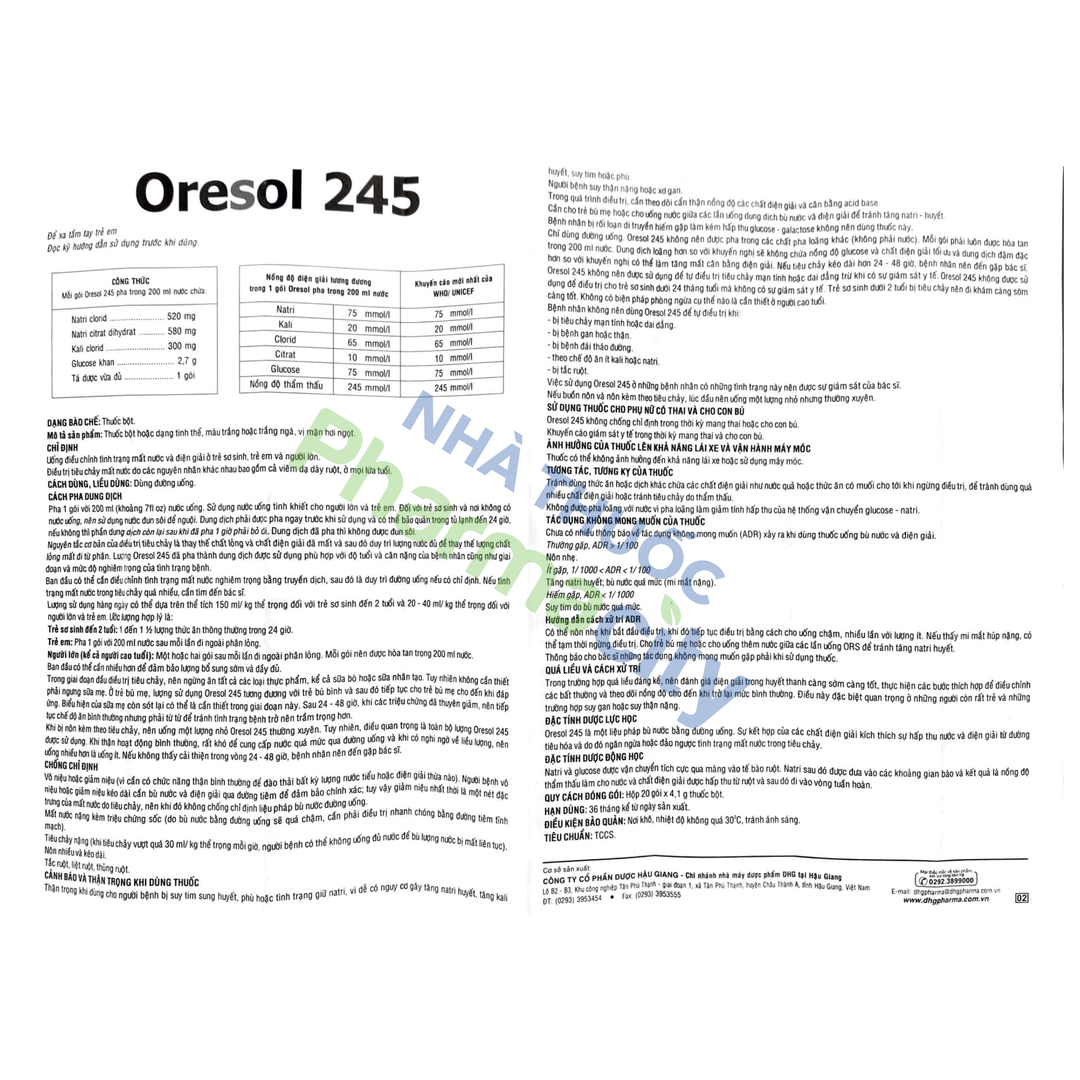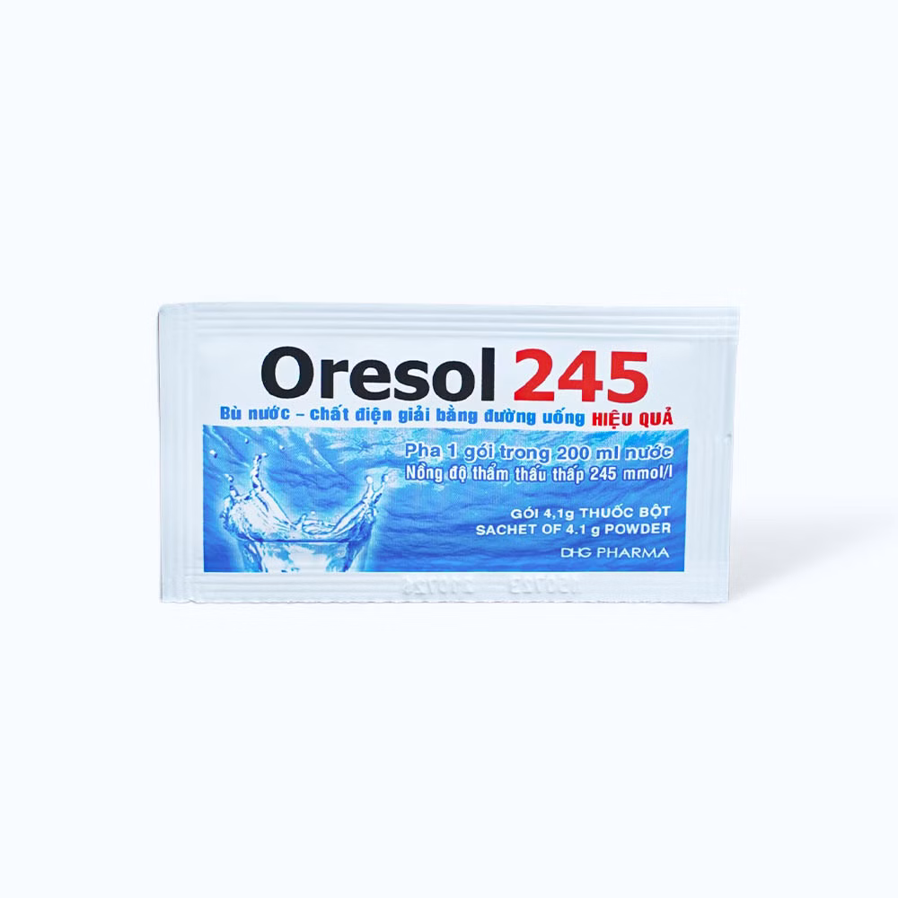 Oresol 245 là dung dịch bù nước và chất điện giải có nồng độ thẩm thấu thấp theo khuyến cáo mới nhất của Tổ chức y tế thế giới (WHO) được dùng trong điều trị các trường hợp mất nước.