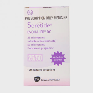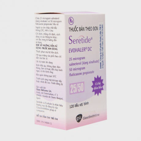 Khí dung Seretide Evohaler DC 25/50mcg điều trị hen, bệnh phổi tắc nghẽn mãn tính là thuốc hít khí dung kết hợp hai hoạt chất Salmeterol và Fluticasone. Thuốc được sử dụng để điều trị và kiểm soát hen suyễn và bệnh phổi tắc nghẽn mạn tính (COPD).