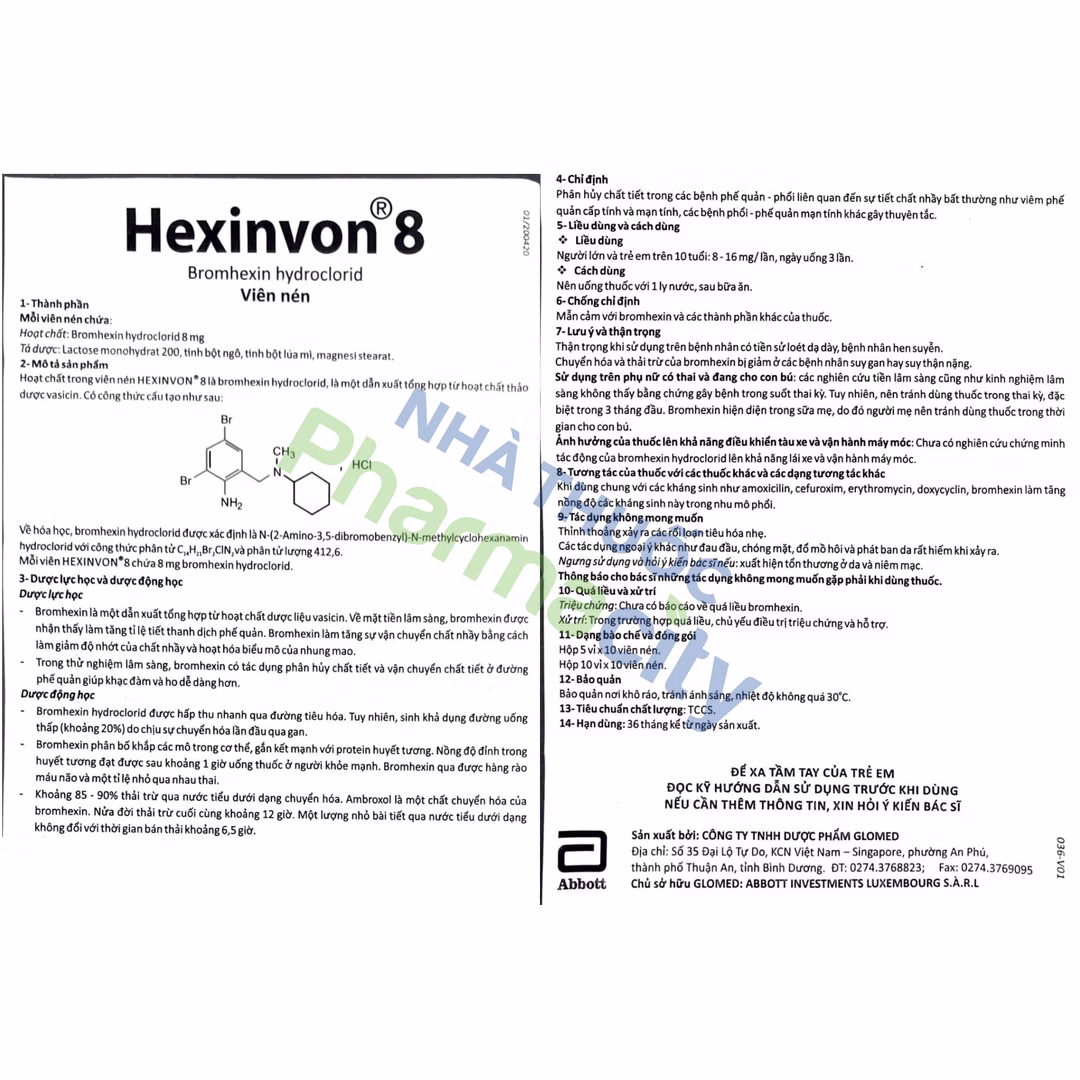 Hexinvon 8mg là một loại thuốc được sử dụng để làm tiêu nhầy, loãng đàm. Thành phần chính của Hexinvon 8mg là Bromhexin, có tác dụng phân hủy chất tiết và vận chuyển chất tiết ở đường phế quản giúp khạc đờm và họ dễ dàng hơn.