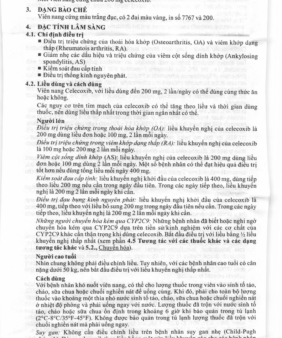 - Hoạt chất: 200mg celecoxib.