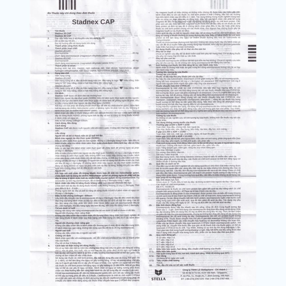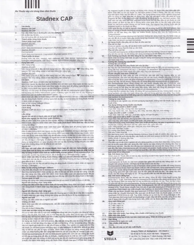 Stadnex 40 CAP thành phần chính là esomeprazol (dưới dạng esomeprazol magnesidihydrat). Thuốc dùng để điều trị bệnh trào ngược dạ dày – thực quản (GERD), chữa lành loét tá tràng do nhiễm Helicobacter pylori và phòng ngừa tái phát loét dạ dày tá tràng, điều trị hội chứng Zollinger – Ellison.