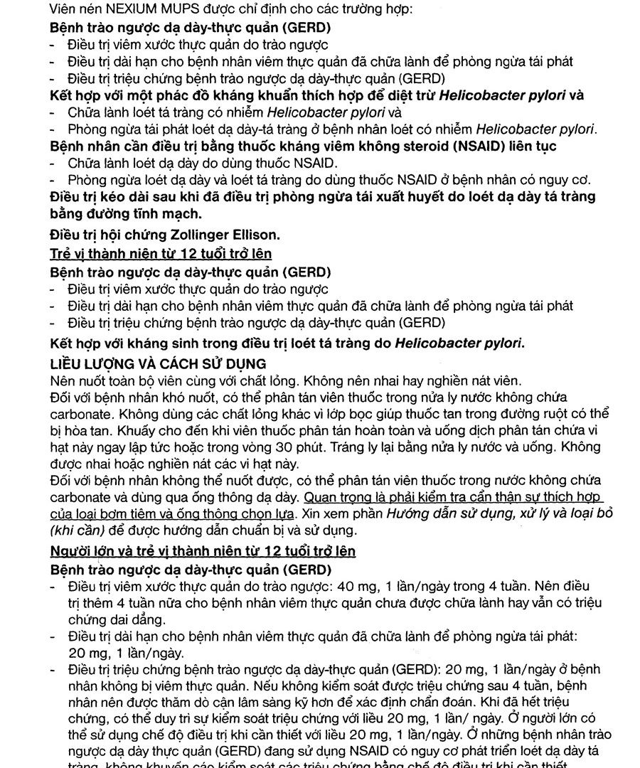 - Điều trị hội chứng zollinger ellison: Liều khởi đầu khuyến cáo là Nexium Mups 40mg, 2 lần/ngày. Sau đó điều chỉnh liều theo đáp ứng của từng bệnh nhân vả tiếp tục điều trị khi còn chỉ định về mặt lâm sàng. Các dữ liệu lâm sàng cho thấy phần lớn bệnh nhân được kiểm soát với esomeprazole liều từ 80 – 160mg/ngày. Khi liều hàng ngày lớn hơn 80mg, nên chia Iiều dùng thành 2 lần/ngày.