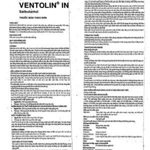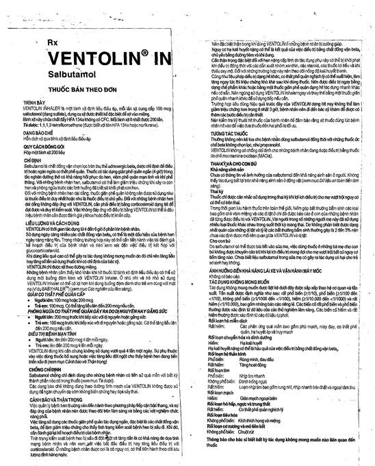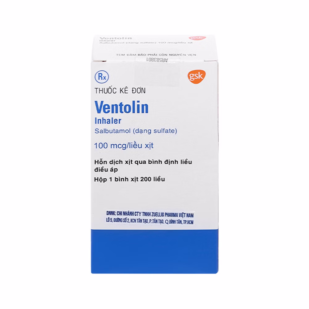 Ventolinlà bình xịt định liều đóng gói thành hộp một bình xịt 200 liều. Thuốc có hoạt chất làsalbutamolcó tác dụng giãn cơ trơn phế quản.
