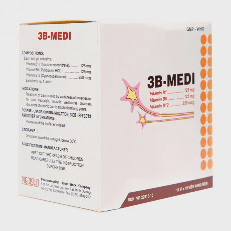 Viên nang 3B Medilà thuốc bổ sung vitamin B1, B6, và B12, giúp điều trị và phòng ngừa các rối loạn do thiếu hụt các vitamin nhóm B. Mỗi hộp chứa 10 vỉ, mỗi vỉ 10 viên, hỗ trợ cải thiện sức khỏe thần kinh và chức năng cơ thể.