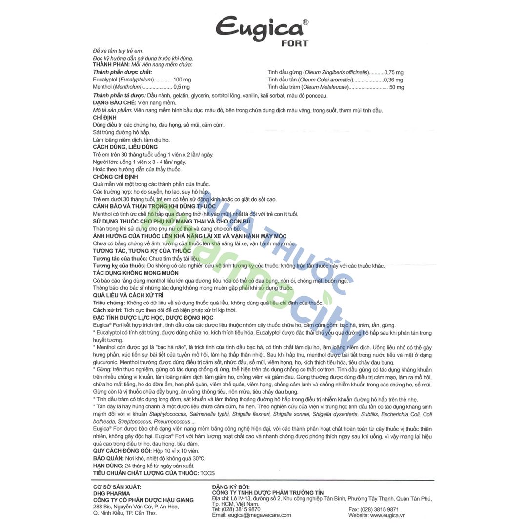 Viên nang Eugica Fortlà một loại thuốc thảo dược phổ biến, được nhiều người tin dùng để giảm các triệu chứng khó chịu khi bị cảm cúm hoặc viêm họng. Thuốc này có tác dụng làm giảm và điều trị các triệu chứng ho, đau họng, sổ mũi, cảm cúm.