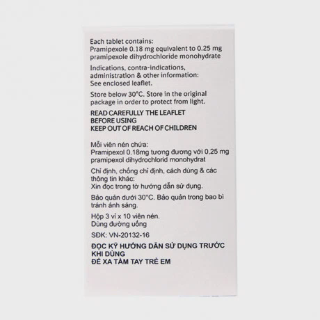 - Hoạt chất: Pramipexol dihydrochlorid monohydrat 0.25mg (tương đương 0.18mg pramipexol dạng bazơ) hoặc 1mg (tương đương 0.7mg pramipexol dạng bazơ). Có thể bẻ đôi viên nén.