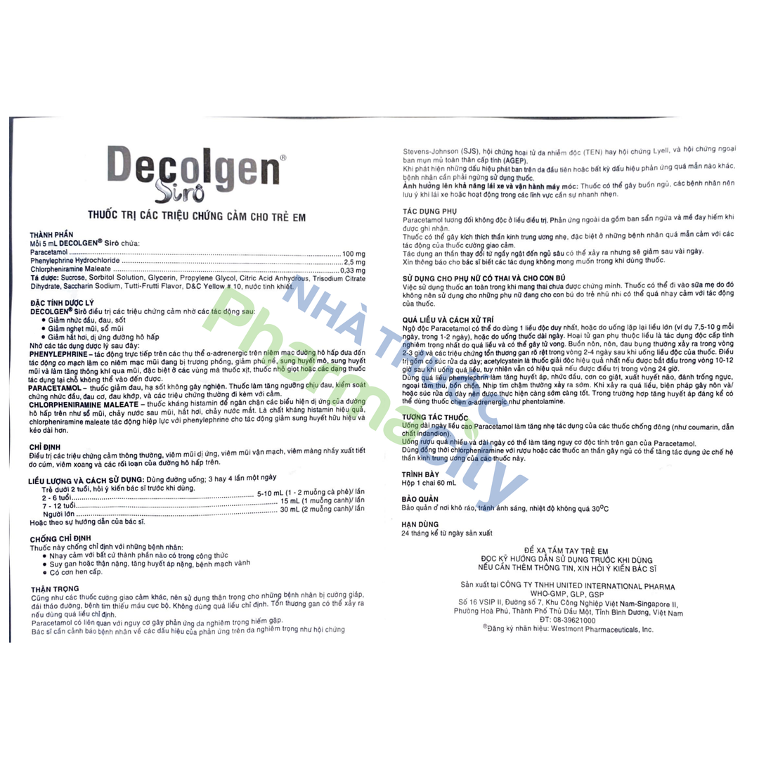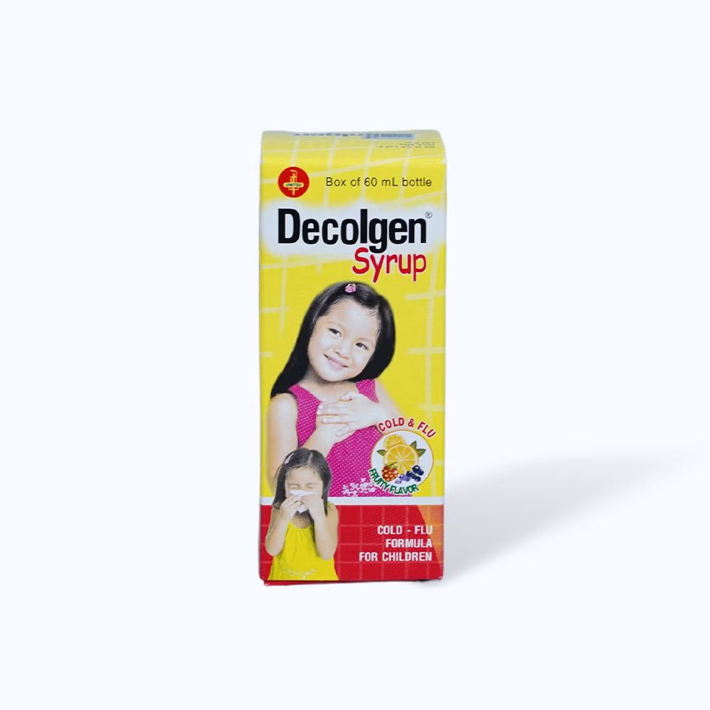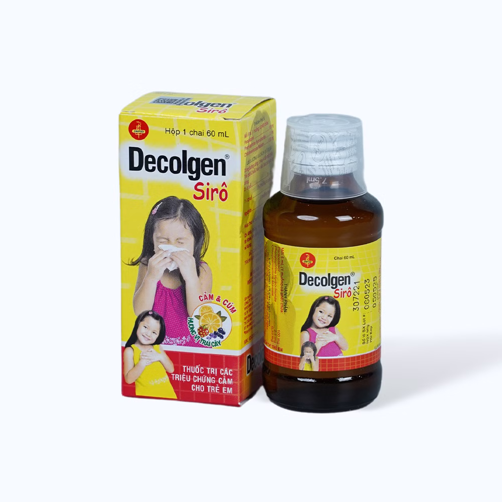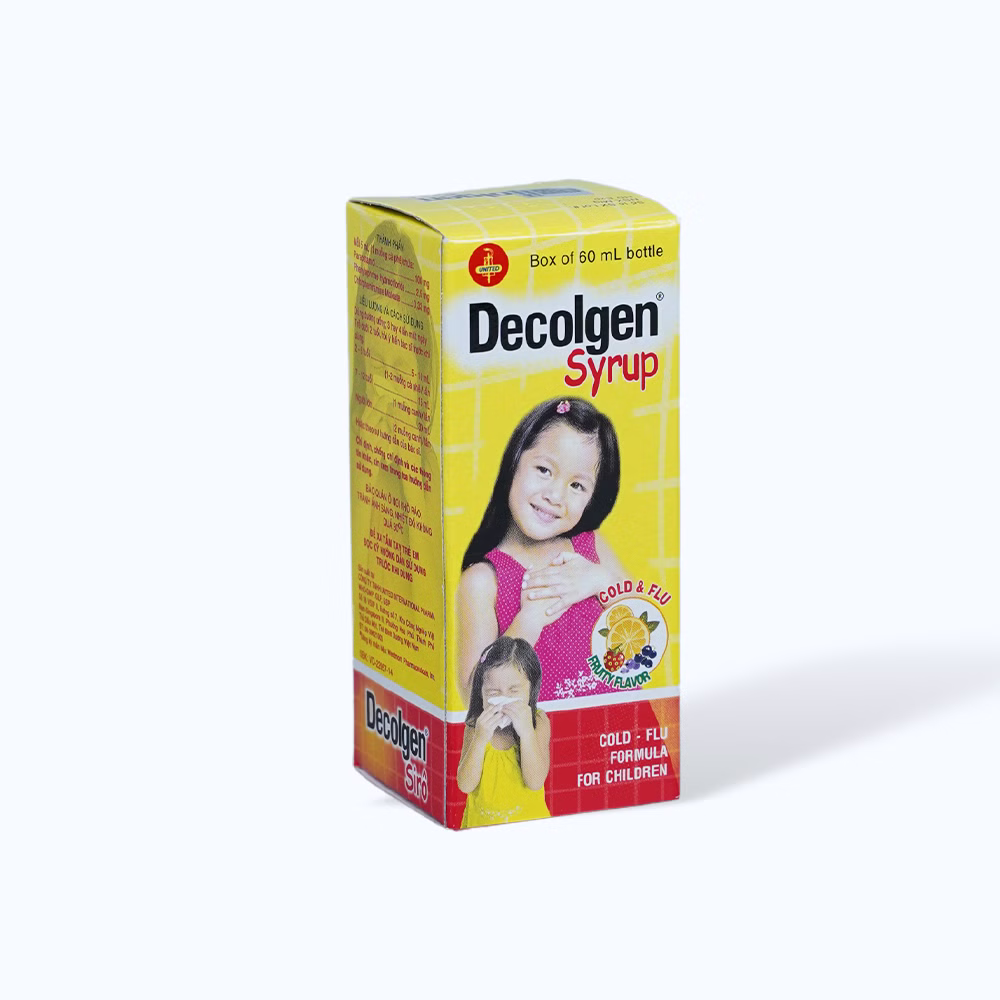 Siro Decolgen 60Ml của công ty TNHH United International Pharma, thành phần chính paracetamol, phenylephrine hydrochloride, chlorpheniramine maleate, là thuốc dùng để điều trị các triệu chứng cảm thông thường, viêm mũi dị ứng, viêm mũi vận mạch, viêm màng nhầy xuất tiết do cúm, viêm xoang và các rối loạn của đường hô hấp trên.