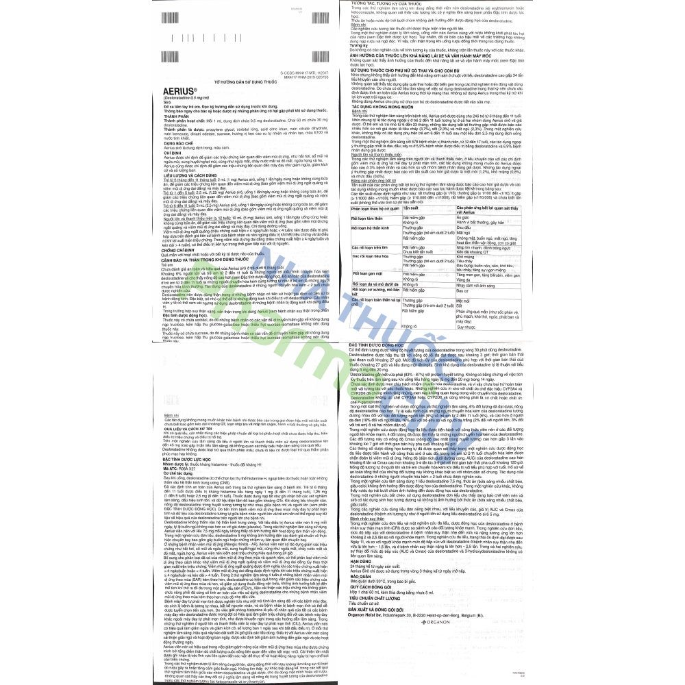 Thuốc Aerius 0.5mg/ml của Công ty Schering (Bỉ), thuốc có thành phần chính là Desloratadine. Đây là một thuốc thuộc nhóm kháng histamin và kháng dị ứng. Thuốc dị ứng Aerius 0.5mg/ml được chỉ định để giảm nhanh các triệu chứng đến viêm mũi dị ứng như hắt hơi, sổ mũi, ngứa mũi, sung huyết, nghẹt mũi hay ngứa, chảy nước mắt, đỏ mắt, ngứa họng và ho. Thuốc này cũng được dùng để giảm triệu chứng mề đay như giảm ngứa, giảm kích thước và số lượng phát ban. Một số tác dụng khác của thuốc không được liệt kê trên nhãn thuốc đã được phê duyệt nhưng bác sĩ có thể chỉ định bạn dùng. Bạn chỉ sử dụng thuốc này để điều trị một số bệnh lý chỉ khi có chỉ định của bác sĩ.