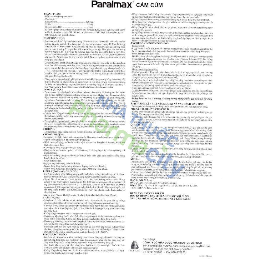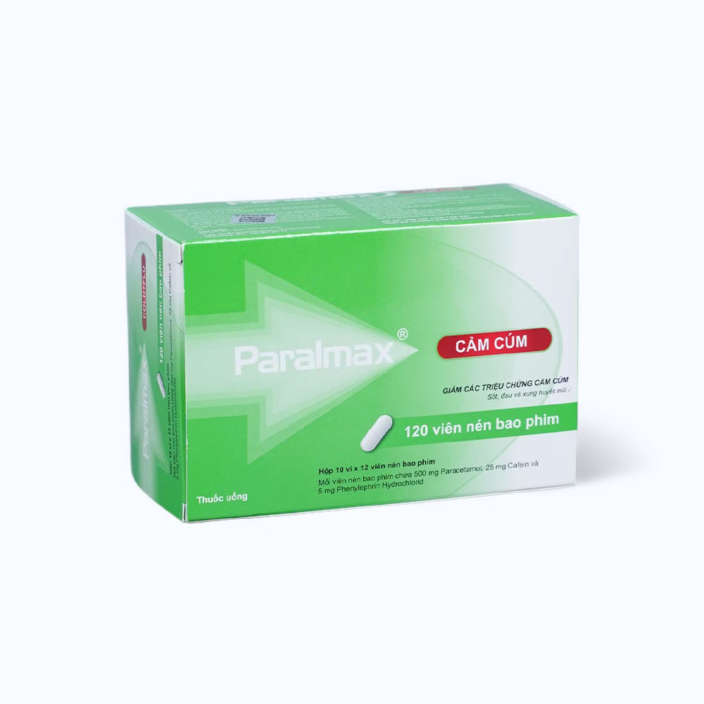 Viên nén Paralmax cảm cúm làmột loại thuốc giảm đau và hạ sốt, giảm xung huyết mũi. Có chứa hoạt chất là paracetamol (acetaminophen), Phenylephrin HCL, Cafein. Đây là một loại thuốc phổ biến được sử dụng để giảm các triệu chứng của cảm cúm như sốt, đau và xung huyết mũi.
