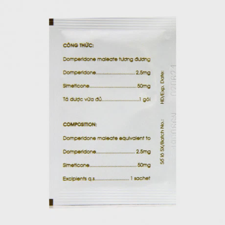 - Hoạt chất:Domperidone maleate tương đương domperidone 2.5mg, Simeticone 50mg.