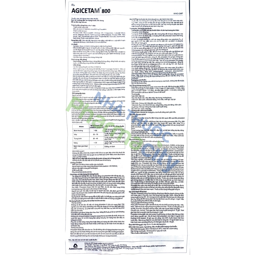 Viên nén Agicetam 800mg là một loại thuốc kê đơn chứa hoạt chất Piracetam, được sử dụng để điều trị các bệnh tổn thương não và chứng chóng mặt. Thuốc có dạng viên nén bao phim và được sản xuất bởi Công ty Cổ phần Dược phẩm Agimexpharm, Việt Nam.