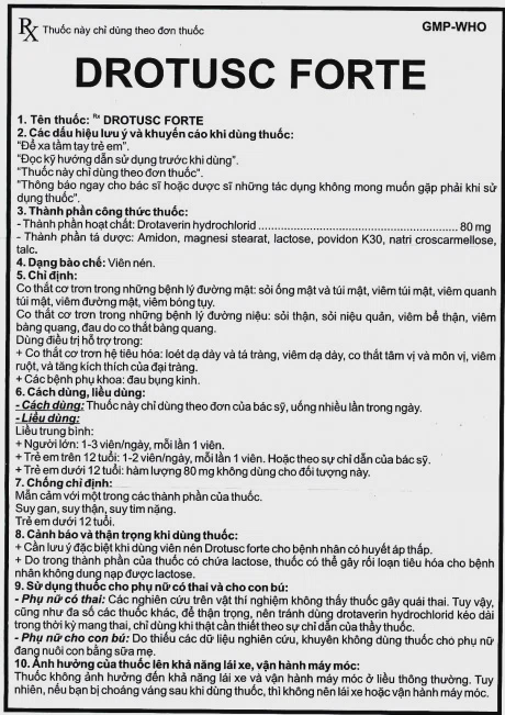 – Thời kỳ mang thai: Các nghiên cứu trên vật thí nghiệm không thấy thuốc gây quái thai. Tuy vậy, cũng như đa số các thuốc khác, để thận trọng, nên tránh dùng Drotaverin hydroclorid kéo dài trong thời kỳ mang thai, chỉ dùng khi thật cần thiết theo sự chỉ dẫn của thầy thuốc.