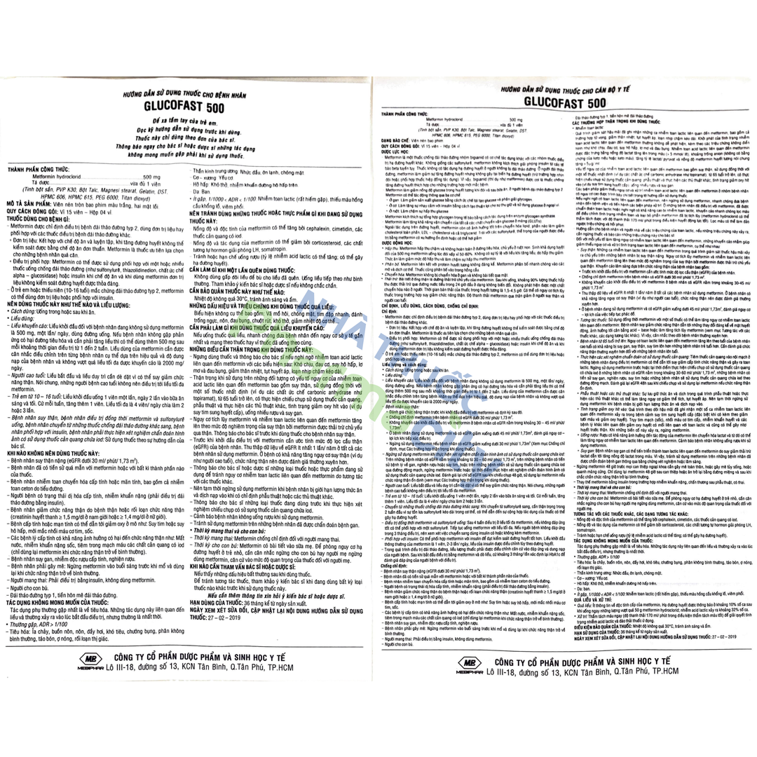 Glucofast 500mg là thuốc chứa hoạt chất Metformin hydroclorid, được chỉ định điều trị bệnh đái tháo đường không phụ thuộc insulin (typ 2) khi chế độ ăn đơn thuần không kiểm soát được glucose huyết. Thuốc có thể được dùng kết hợp với một sulfonylurê khi điều trị đơn thuần không hiệu quả.