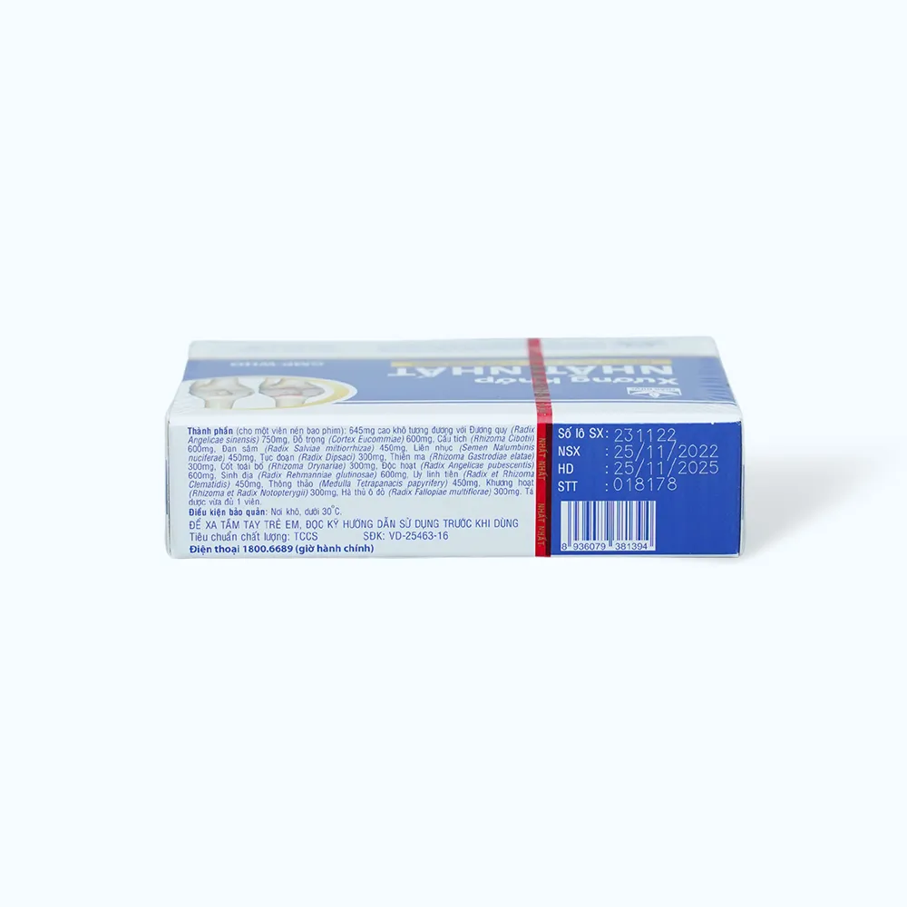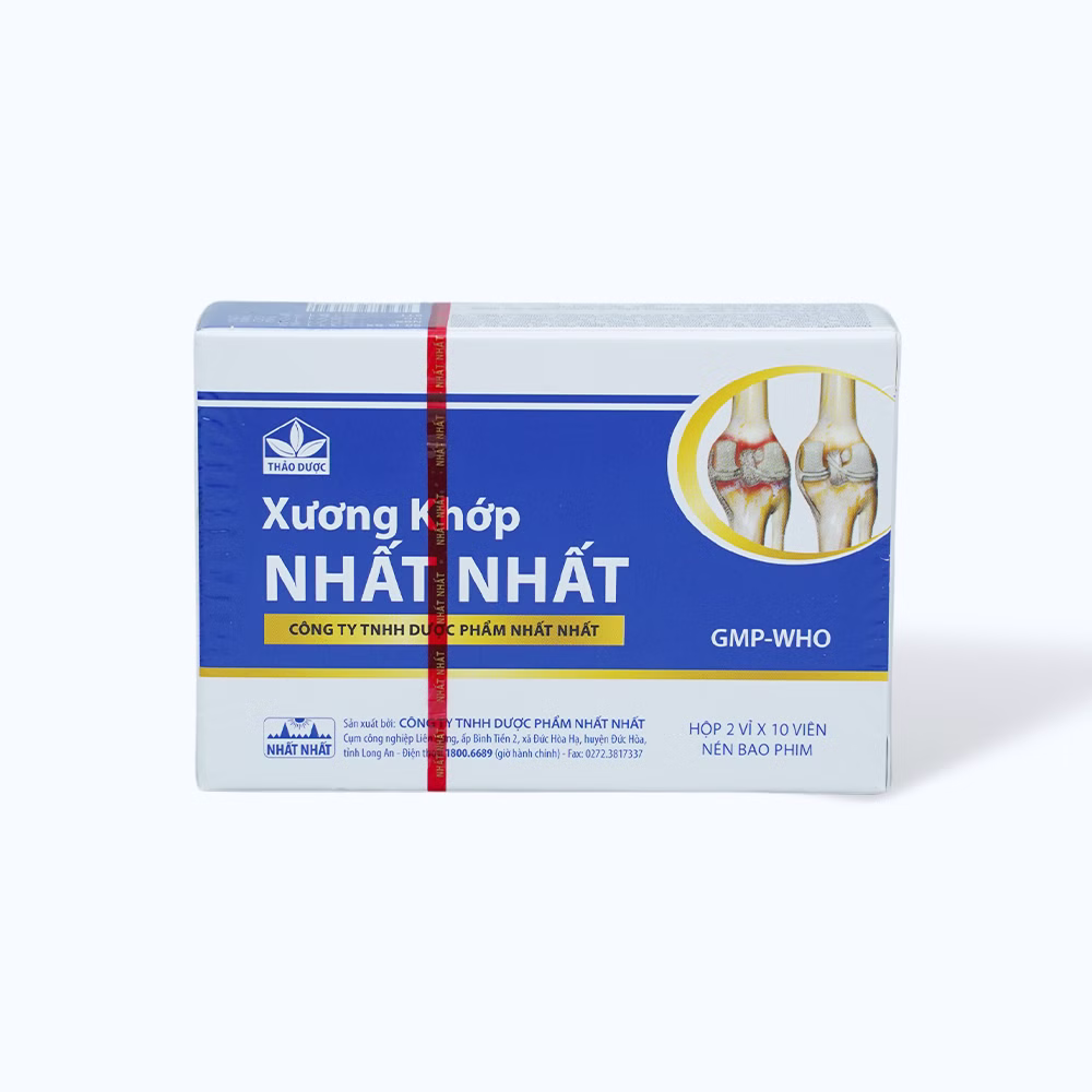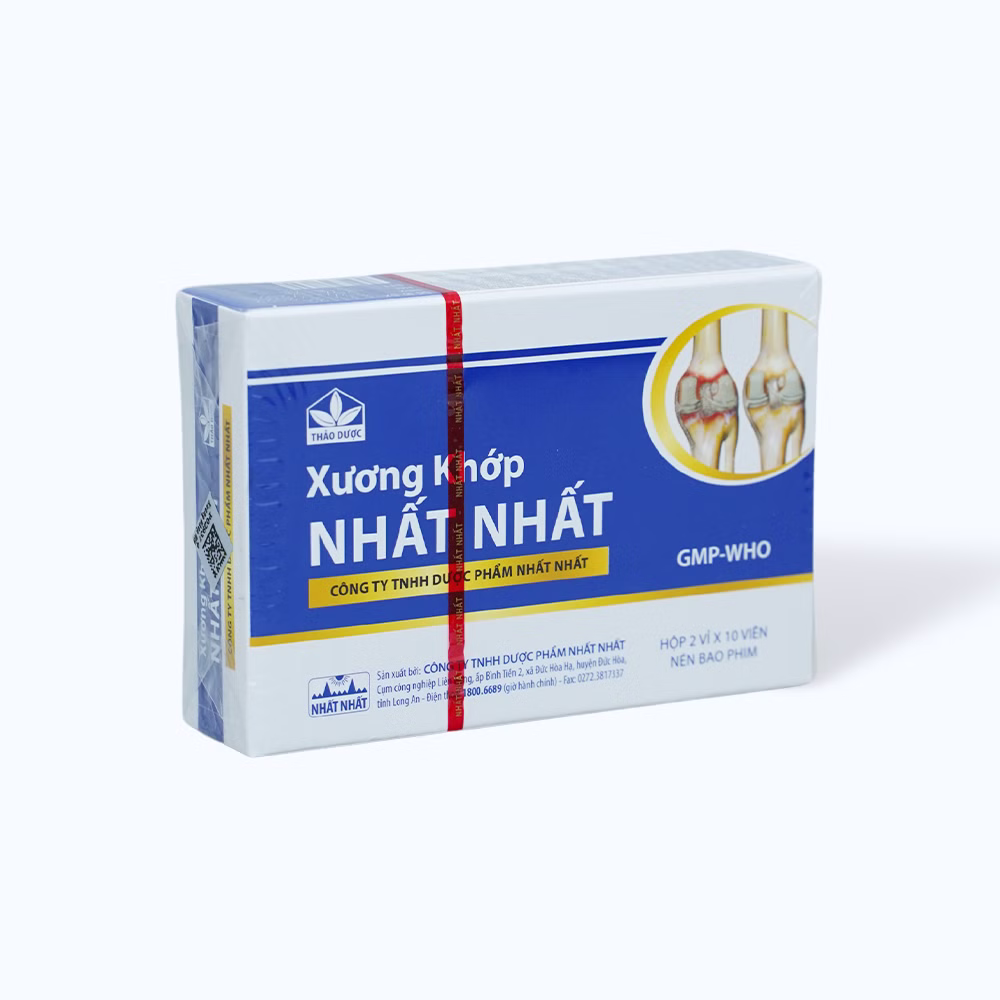 Xương Khớp Nhất Nhất là thuốc điều trị các chứng đau lưng, đau thần kinh tọa, các chứng phong tê thấp, hỗ trợ điều trị thoái hóa, vôi hóa, gai cột sống, và hỗ trợ phòng ngừa bệnh tái phát. Thuốc được sản xuất bởi công ty TNHH Dược phẩm Nhất Nhất.