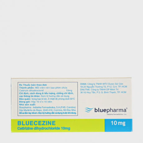 - Bluecezin 10mg là thuốc kháng histamin dạng viên nén, được đóng gói trong hộp 10 vỉ, mỗi vỉ 10 viên.