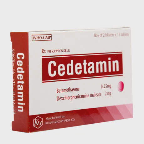 Cedetamin 2mg 2X15 của Công ty cổ phần dược phẩm Khánh Hòa, thành phần chính Betamethason, Cedetamin điều trị viêm mũi dị ứng, nổi mề đay, hen phế quản mãn, viêm lách do dị ứng, phản ứng phản vệ với thuốc, viêm da dị ứng, chàm, viêm da do tiếp xúc, viêm kết mạc dị ứng.