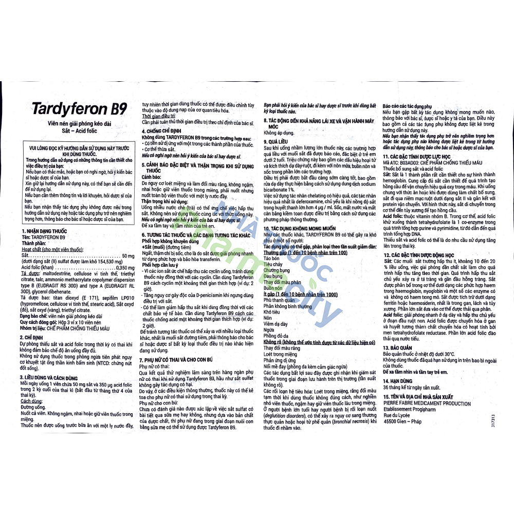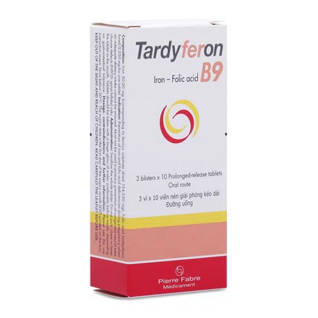 Tardyferon B9 là sản phẩm của Công ty Pierre Fabre (Pháp), thành phần chính là sắt và acid folic, là thuốc chống thiếu máu.