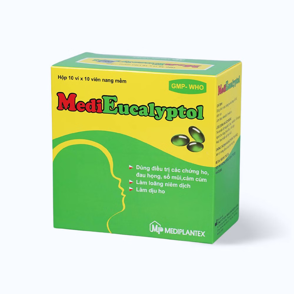 Medi Eucalyptol là thuốc điều trị các chứng ho, đau họng, sổ mũi, cảm cúm. Sát trùng đường hô hấp, làm loãng niêm dịch, làm dịu ho.