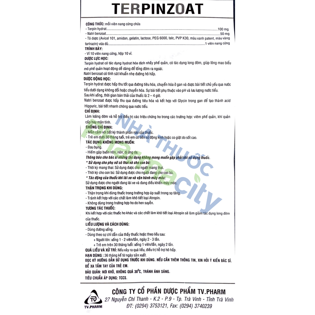 Viên nang Terpinzoatlà một loại thuốc thường được sử dụng để điều trị ho và làm loãng đờm trong các bệnh lý đường hô hấp như viêm phế quản, viêm phổi. Thành phần chính của thuốc là Terpin hydrate, một chất giúp tăng tiết dịch nhầy ở đường hô hấp, làm giảm độ đặc của đờm và dễ dàng ho ra ngoài.