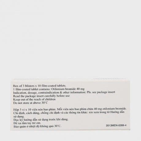 - Nghiên cứu trên động vật cho thấy otilonium bromide hầu như không gây độc tính. Trên người, thuốc cũng không gây tác dụng gì đặc biệt khi dùng quá liều. Trong trường hợp quá liều, có thể dùng các liệu pháp điều trị triệu chứng hoặc các liệu pháp điều trị hỗ trợ thích hợp.