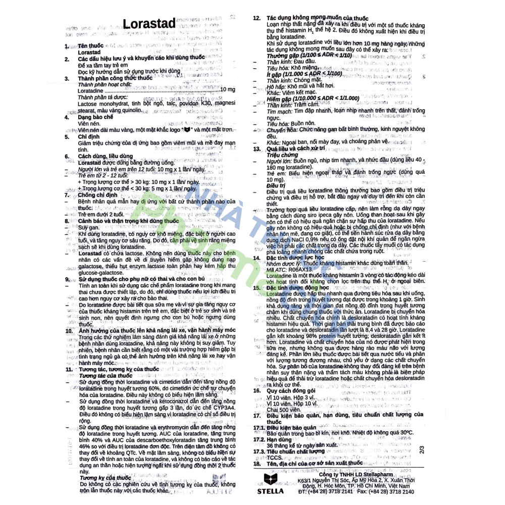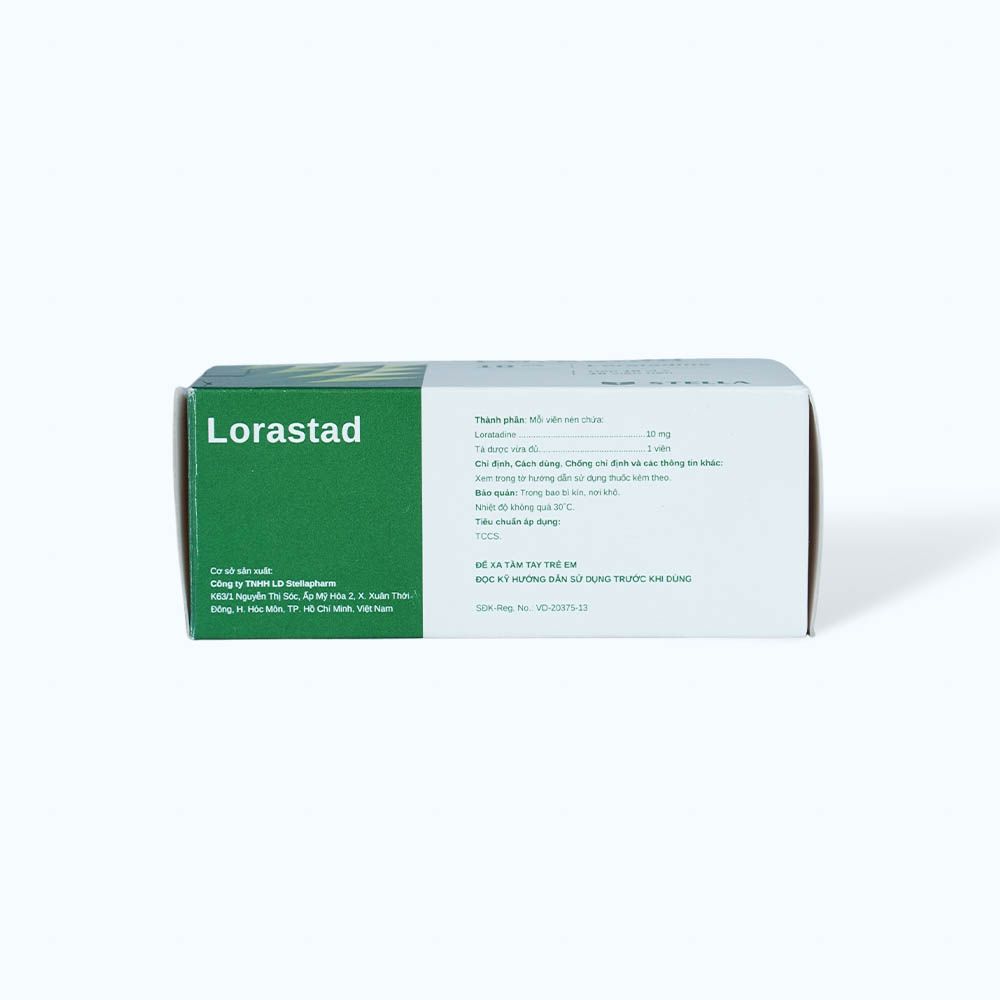 Lorastad Stella 10mg là một loại thuốc kháng histamine dùng để điều trị các triệu chứng dị ứng như hắt hơi, ngứa mũi, chảy nước mũi, ngứa mắt, chảy nước mắt, và nổi mề đay. Thành phần chính của Lorastad Stella 10mg là Loratadin, một loại thuốc kháng histamine thế hệ hai, ít gây buồn ngủ hơn so với các thuốc kháng histamine thế hệ một. Thuốc thường được sử dụng để điều trị dị ứng theo mùa hoặc dị ứng mạn tính và các phản ứng dị ứng khác.