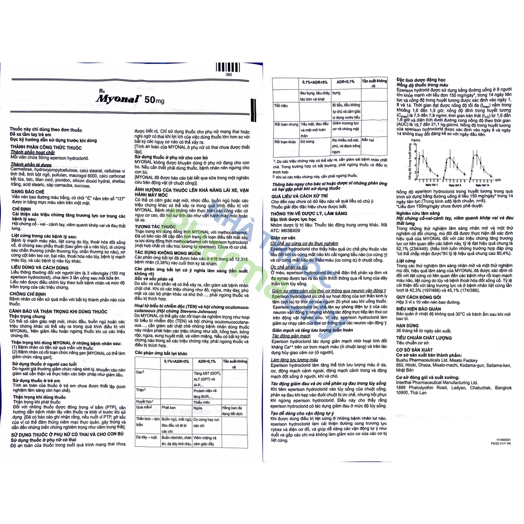 - Khi Myonal 50mg được dùng điều trị liệt cứng ở những bệnh nhân lụt não, thuốc làm cải thiện đường cong trương lực Cybex và điện cơ đồ. Myonal 50mg làm dễ dàng các vận động tự ý như duỗi và gấp các chi mà không làm giảm sức cơ.