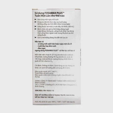 Để đưa thuốc xuống dạ dày dễ dàng nhằm giảm khả năng kích ứng thực quản, phải uống Fosamax Plus với một cốc nước đầy (từ 200 ml trở lên) vào lúc mới ngủ dậy trong ngày. Người bệnh không được nằm cho đến sau khi ăn bữa ăn đầu trong ngày và bữa ăn này phải sau khi uống thuốc Fosamax Plus ít nhất 30 phút. Bệnh nhân không được nhai hoặc để viên thuốc tan trong miệng vì nguy cơ gây loét hầu họng. Nếu không tuân thủ những chỉ dẫn này, nguy cơ tác dụng ngoại ý trên thực quản có thể tăng lên.