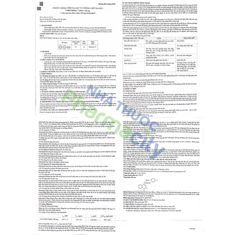 – Những bệnh nhân sử dụng Mucosta lâu dài nên được giám sát một cách định kỳ bất cứ dấu hiệu hay triệu chứng men gan cao, giảm lượng bạch cầu và/hoặc lượng tiểu cầu.