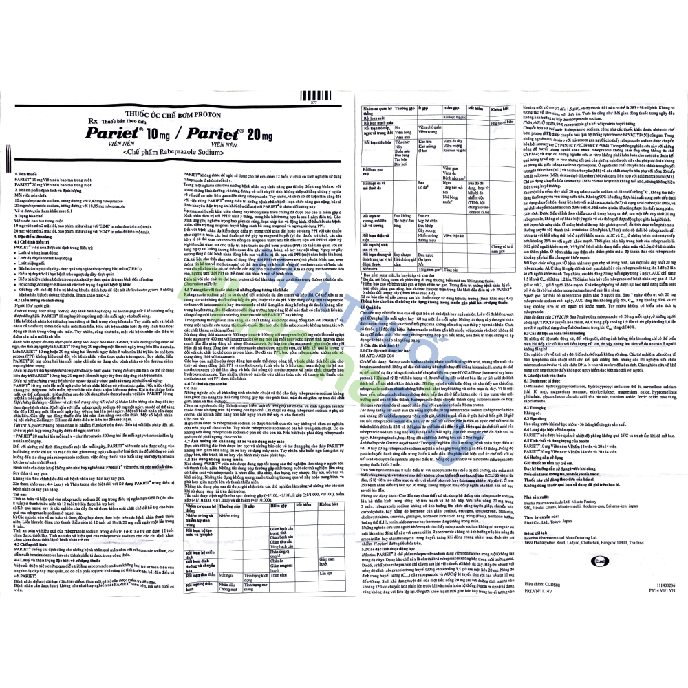 PARIET® 20 mgđược sản xuất bởiBushu Pharmaceuticals Ltd. Misato Factory (Japan), thành phần chính là Rabeprazole sodium được dùng trong điều trị loét dạ dày, loét tá tràng, loét miệng nối, viêm thực quản hồi lưu,hội chứng Zollinger-Ellison.