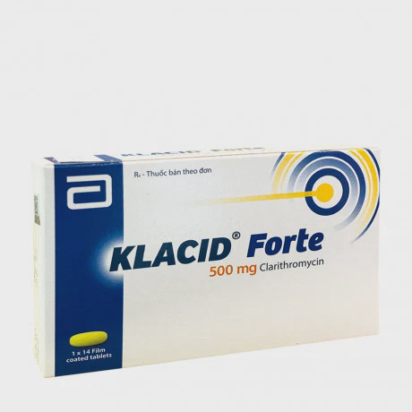 Viên nén Klacid Forte 500mg điều trị nhiễm khuẩn đường hô hấp (1 vỉ x 14 viên) là sản phẩm của Công ty Abbott, có thành phần chính là Clarithromycin, được dùng để điều trị các nhiễm trùng gây ra bởi các vi khuẩn nhạy cảm: Nhiễm trùng đường hô hấp dưới như viêm phế quản cấp và mạn tính, viêm phổi Mycoplasma Pneumoniae và Legionella, bạch hầu, giai đoạn đầu của ho gà, nhiễm khuẩn cơ hội do Mycobacterium, nhiễm trùng đường hô hấp trên như viêm xoang và viêm họng.