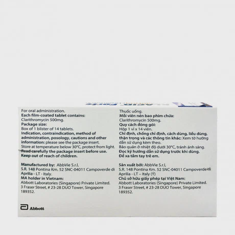 Viên nén bao film, hình trái xoan màu vàng chứa 500mg clarithromycin. Mỗi viên được khắc biểu trưng của Abbott trên một mặt.