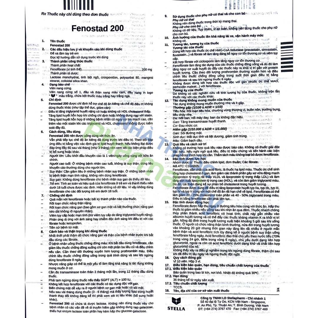 Fenostad 200mg là một loại thuốc kê đơn dưới dạng viên nang, chứa hoạt chất Fenofibrate 200mg, được sử dụng để điều trị tăng cholesterol máu và giảm mỡ máu.