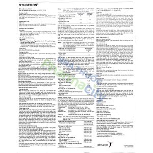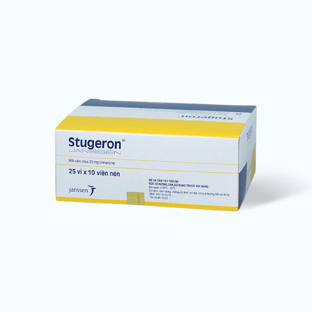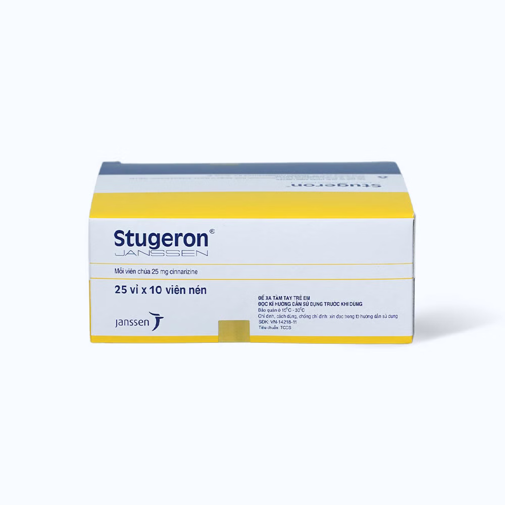 - Stugeron 25mg được sản xuất bởi công ty Olic (Thái Lan) Limited (đăng ký bởi Janssen-Cilag G Ltd., Thái Lan), thành phần chính cinnarizin. Thuốc được sử dụng để điều trị các rối loạn tuần hoàn não, rối loạn thăng bằng, rối loạn tuần hoàn ngoại vi, say tàu xe.